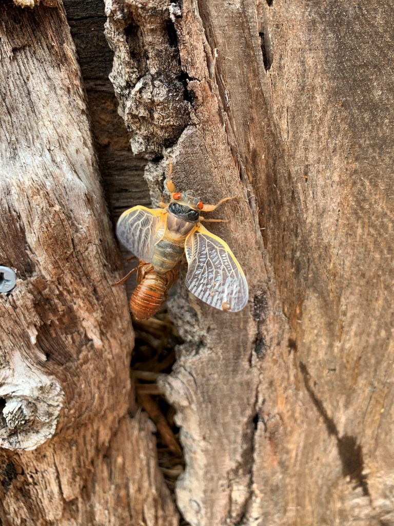 I really didn’t know a lot about cicadas until this year. I did not grow up in this area. I was born in Indiana and went to school in Pennsylvania. We always had crickets in the summer that “sang” at night, but I don’t remember anything like these cicadas. They are loud! They are loudest in the hottest part of the day. It is like a buzzing, humming sound. I’m going to call it “thrumming” because it almost has a beat or rhythm to it.