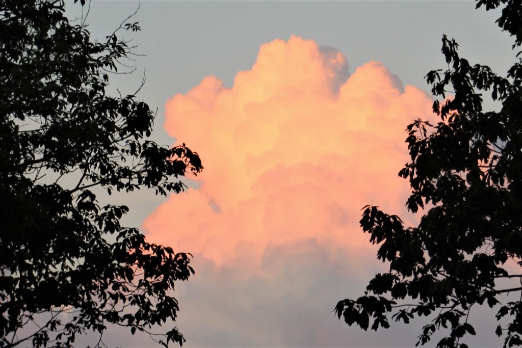 The sun slowly rises, light spreads, growing, then bursts through the clouds in warm hues.