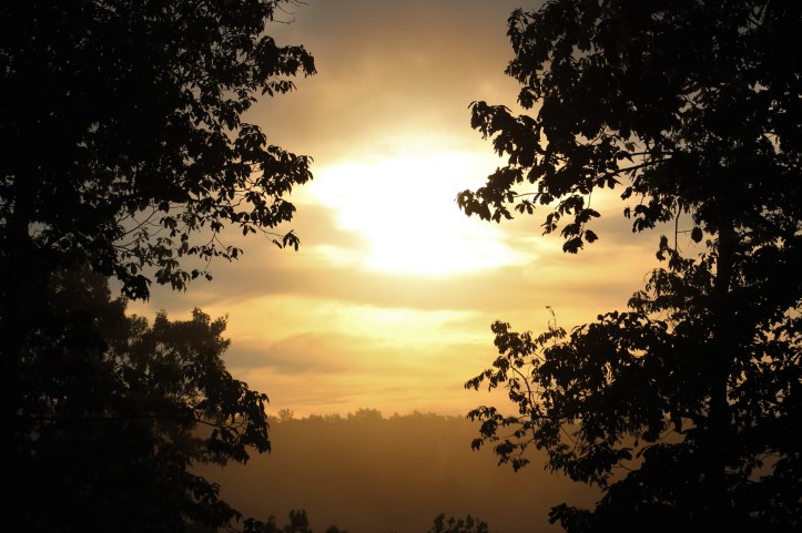 The early morning sun breaking through the dark clouds and fog left over from last night’s storm.